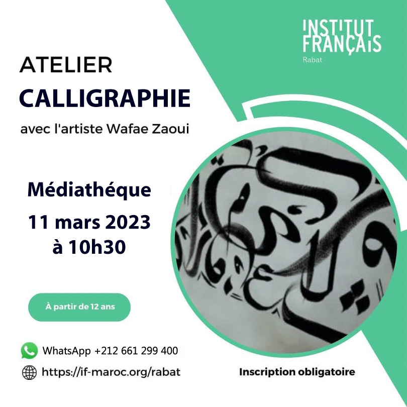 La Médiathèque de l’Institut Français de Rabat vous propose de vous initier à la calligraphie avec l’artiste Wafae Zaoui. La calligraphie est l’art de mettre en scène l’écriture de manière harmonieuse et esthétique. Discipline globale et spirituelle, elle permet l’harmonie entre le corps et l’intellect à travers le maniement du pinceau.