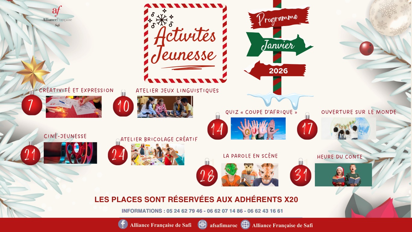 L’Alliance Française de Safi souhaite une joyeuse année à ses jeunes adhérents à l’Espace X20 et les invite à participer à une série d’activités ludiques et créatives favorisant l’apprentissage, l’échange et l’épanouissement.