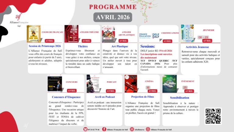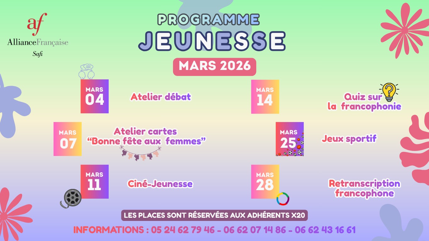 Mars à l’espace X20 : un mois riche en émotions, en apprentissage et en aventure. L’Alliance Française de Safi invite ses jeunes adhérents à s’exprimer, agir et s’épanouir à travers un calendrier éclectique.