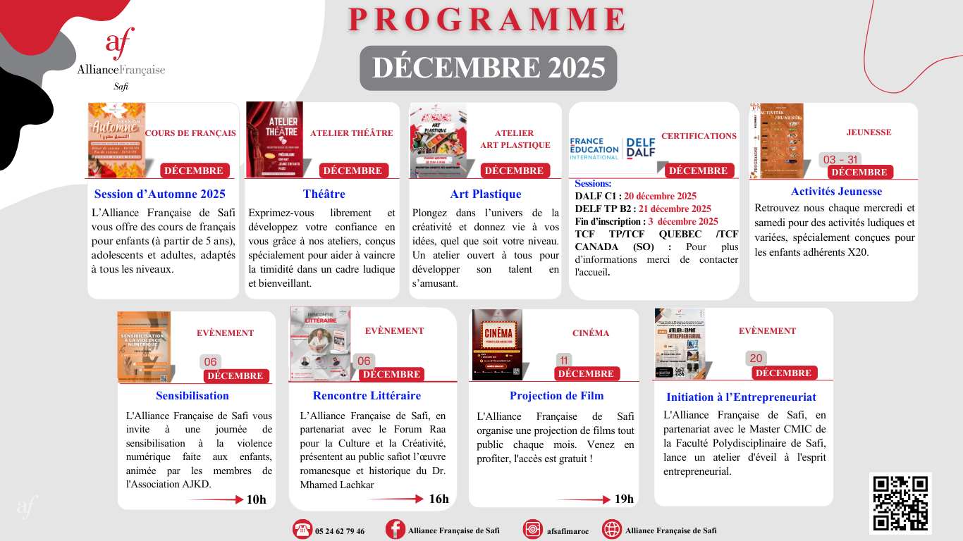 Soyez nombreuses et nombreux à rejoindre l’Alliance Française de Safi pour explorer, apprendre et vous épanouir ensemble en ce dernier mois de l’année.