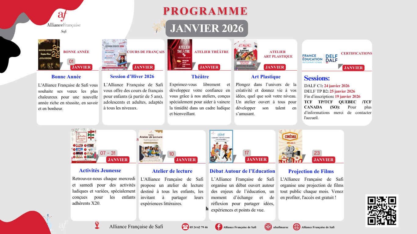 Soyez nombreuses et nombreux à rejoindre l’Alliance Française de Safi pour rendre ce début d’année créatif, ludique et rassembleur.
